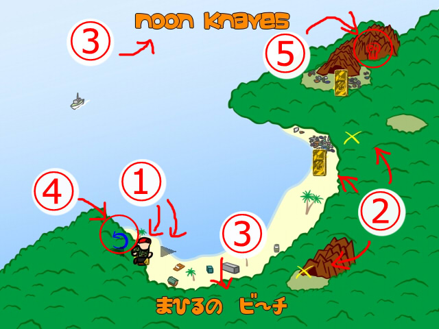 - ①レッド(主人公)の位置。矢印が出ている方向を入力すると規定の移動をする。